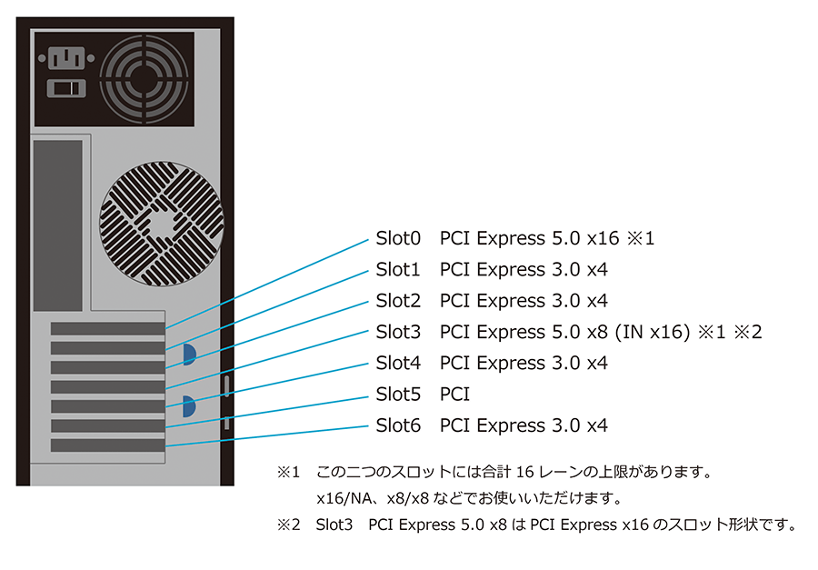 背面には拡張スロットが7つあり、グラフィックスボードだけでなく、LANボード増設等のカスタマイズも可能です。